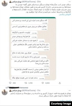 ساعتی بعد حساب توماج صالحی در توئیتر ضمن رد ادعای بازداشت او «هنگام خروج از مرز»، تصویری از پیام قبلی آقای صالحی به گرداننده حسابش را هم منتشر کرد که در آن توصیههای او برای بعد از بازداشت دیده میشود.