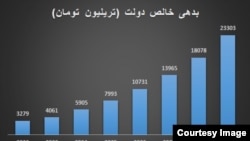 داده‌های پایگاه اطلاعاتی صندوق بین‌المللی پول می‌گوید حجم کل بدهی خالص دولت در سال گذشته چهار هزار تریلیون تومان بود و انتظار می‌رود تا سال ۲۰۲۹ به سرعت افزایش یافته و به رقم ۲۳ هزار تریلیون تومان اوج بگیرد.