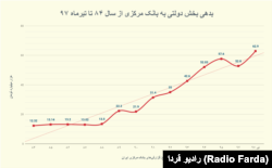 بررسی بدهی بخش دولتی به بانک مرکزی در دوره زمانی سال ۸۴ تا تیرماه سال ۹۷، (نمودار زیر) نشان میدهد که اگرچه دولتها در دورههایی بخش کوچکی از بدهی خود به بانک مرکزی را تسویه کردهاند، اما در مجموع این روند رو به رشد بوده است.
