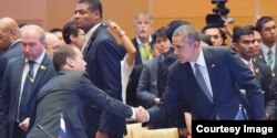 اوباما و مدودف) باراک اوباما یکبار با دیمیتری مدودیف نخستوزیر وقت فدراسیون روسیه در شهر پراگ (جمهوری چک)، در ۸ آوریل ۲۰۱۰، دیداری دوستانه داشت. اما ریاست جمهوری مدودیف نوعی چرخش قدرت با توافق پوتین بود و تقریباً کسی آن را جدی نگرفت. وقتی مدودیف رئیسجمهور شد، پوتین به جای او نخستوزیر و همهکاره و منتظر دور بعد انتخابات ریاست جمهوری بود.