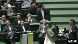 محمود احمدی نژاد، رییس جمهوری اسلامی، عصر روز يکشنبه با حضور در مجلس شورای اسلامی، ضمن مخالفت با استيضاح وزير کار، نواری را پخش کرد که به گفته وی، مکالمه ميان برادر رييس مجلس و سعيد مرتضوی است. آقای احمدی نژاد به طور تلويحی، علی لاريجانی را متهم کرد که پشت پرده استيضاح وزير کار است.