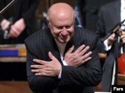 فرهاد فخرالدینی، رهبر ارکستر ملی ایران، در حال ادای احترام به حضار شرکت کننده در کنسرت موسیقی ایرانی