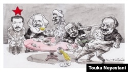 خب حالا مهمانها دارند این سه خورشت بسیار خوشمزه را صرف میکنند و موسیقی بسیار زیبای ای ایران ای سرای امید آقای شجریان را گوش میدهند و حالا رسیدهاند به آخر غذایشان. وقتش هست که با هم یک خورده مراوده کنند. بین مارکس و حافظ و کیانوری و جزنی و کارتر فکر میکنی چه صحبتهایی رد و بدل میشود؟ فکر میکنی مارکس از جزنی و نظریهاش خوشش بیاید و جزنی واقعاً اندیشه مارکس را دنبال کرده؟
