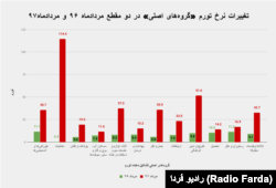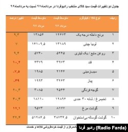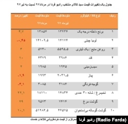 بررسی تغییرات قیمت ده قلم کالای مندرج در سبد منتخب کالاهای رادیوفردا نیز، نشان میدهد که روند عمومی افزایش قیمتها، این کالاهای پرمصرف در سبد غذایی خانوارهای ایرانی را تحت تاثیر قرار داده است.