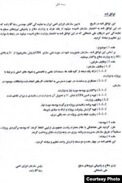 تایمز بریتانیا که خبرنگارش این اسناد را دیدهاست، نامهای را از میان اوراق محرمانه ایرانی منتشر کرد که توافقنامهای به زبان فارسی میان سازمان انرژی اتمی ایران در زمان ریاست رضا آقازاده با وزارت دفاع ایران در زمان وزارت علی شمخانی است.