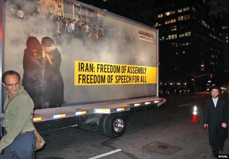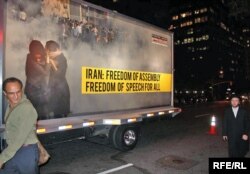 یکی از کامیون‌هایی که با بیلبورد مربوط به حوادث انتخابات در اطراف سازمان ملل در گردش است. بر بیل‌بورد نوشته شده است: «قتل، شکنجه و تجاوز. از احمدی‌نژاد به عنوان مسئول توضیح بخواهید.»