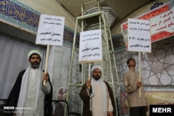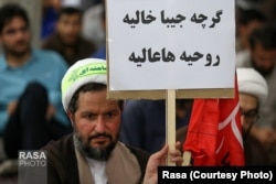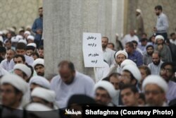 شاید تنها شعارنوشته کمتر سیاسی تایپی یا چاپی این تجمع٬ این پیام باشد که در دست این روحانی دیده میشود که مضمون آن اقتصادی و معیشتی است.